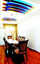 吊顶造型新颖别致,两组悬挑胡桃木横梁造就了空间层次感,红蓝黄白的色彩搭配,清新淡雅,置身其中,令人浮想联翩,几根芦苇使天然美景尽显无遗,原来餐厅也能如此装饰。 |