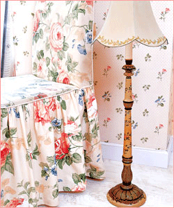 ![]() 墙面的淡粉色壁纸图案很素雅,衬托有鲜丽花朵的布面 沙发 。 窗帘 使阳光变得柔和,而 窗帘 上的图案淡淡的,减弱了 沙发 的出跳,给屋内带来温馨、淡雅的气氛 如果想让家具有这种优雅的花朵感觉,可以买些看起来很有味道的布,做成外套,给家具穿上,像这样,椅子披上大花的裙装,配上秀气的 台灯 ,就可拥有一处迷人的角落