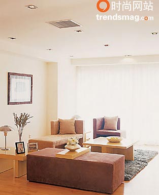 走进室内,首先吸引你目光的就是起居区里没有传统意义的 沙发 ,半长的榻加上容一个人坐的单边靠背椅,再配上长长的坐墩便实现了全部的功能,有朋友来的时候大家可以围坐在一起,谈天说地。独自一人时就惬意地靠在上面看看书,听听音乐。没有“桌腿”的边桌和茶几同属简洁的北欧风格,和低垂的白色纱帘和顶上星星点点的筒灯遥相呼应,既不过于冷静,又没有太多庸脂俗粉的感觉。