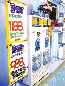 图:卖场中已经没有了特价空调的招牌,取而代之的大多数为“需购2P或2P以上……”才能享受“特价”
