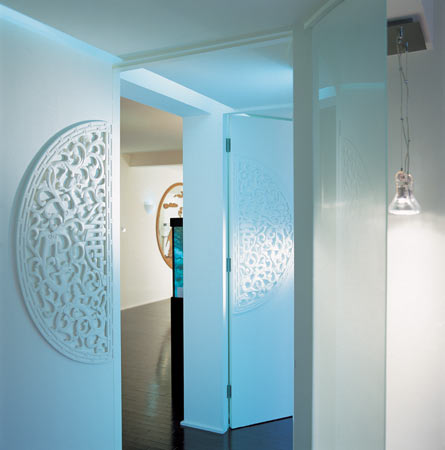 古典与现代的交融 雕花的玄关入口 玄关入口处的木质雕花在视觉上产生出质感反差。 透明的浴室 温婉和谐 透明浴室一个空明的房间,铺以 实木地板 ,再配以舒适的坐垫,还有古色古香的红色宫灯,就可以营造一种温婉和谐的盎然情趣。