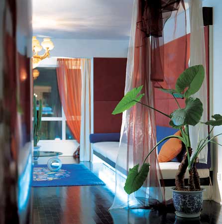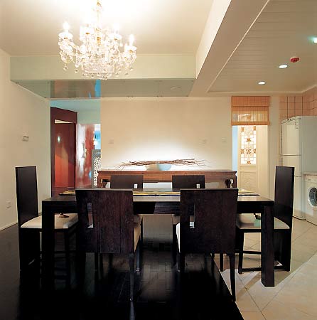 是传统融汇现代,还是现代吸纳传统? 其实,不管张女士承认与否,窗外的景致都不可避免地融入了她的生活。从窗外的景,张女士看到的是北京的传统、北京的现在和北京的未来。同样,她也依稀能从中触摸到自己的生活和事业的印记。自己的成长、事业的成功、家庭的完满,就是伴随着窗外北京的发展一步步实现的,自然,这些变化的印记也烙刻在窗内的世界里。 对传统文化的留恋和对现代生活推崇的并存,是张女士这代人共有的特点。成长和受教育的经历,使其骨子里具有传统意识;而作为律师的她,又始终坚守着现代精神,因此,在对事物的判断和审美过程中,便无可避免地流淌着两种精神气质。在张女士与设计师讨论自己家的设计时,她的这种“矛盾”状态被设计师准确地捕捉到了,然后,设计师便将它们用在现在这个家的设计上了。 惊奇,是每位来访客人的第一感受。在张女士的家,丰富的形式和变化的造型如层出不穷的花样一一展现。现代与传统展开一场材料、形式与色彩的对话,并相互碰撞着、纠缠着,也相互融合着。 她家的总体形态是现代的。“因为我们毕竟生活在现代社会,所需要的也应该是现代生活方式。”设计师遵循主人的要求,以现代语言围合了一个大框架,但在材料上做了一些有趣的变化。他将传统元素的木质雕花窗嵌入玻璃中,或是将镜子镶在木格栅门内。材料上的对抗与平衡尤其具有魅力,小块的雕花窗代替了普通的通风口,在视觉上产生出质感反差,赋予现代材料新的语汇。设计师称其为“新古典主义”,而他解释说:“新古典主义的意义,在于用现代手法来改变传统的尺度与关系,使之合乎现代审美情趣,同时又保留传统的美学意韵。” 设计师和主人在形式上还做了进一步尝试。他们将一些更大体量的古典家具和造型也搬了进来,在厨房里安排了一套“生活大师”的餐桌。不过,他并没有为其配备同样风格的备餐台,而是选用一条长长的中式条案。这种搭配的完美性,体现在相互比例与尺度的和谐上,而且中式条案粗糙的纹理效果,产生出浓浓的亲切感。 大门入口处的衣帽柜,更是精心之作,设计师将柜体做成中式门窗样式,但柜体颜色则刷成了白色,只将雕花的连接处和中间的“福”、“禄”、“寿”做成金色,使之在中式古典风格中透出现代韵味。同样的设计,还体现在书房的次卧室的门上。 空间的魔术——在变化中营造空间 张女士家面积很大,有260平方米,三面临窗。这对设计师来说是件好事,可以充分发挥想像力。因为房子本身的格局很不错,所以设计师并没有做过多的结构调整,而是玩起了空间魔术。 一进张女士家,迎面便是一扇耀眼的红色弧形墙,你好奇的目光就不由自主地会被粘了上去。然后,视线便被它的弧线向两边引去:一侧是客厅,另一侧是次卧室和书房。奇怪了,只是找不到主卧室。但仔细找一番,就会发现在弧形墙正中有一道门,打开这扇门,里面“藏”着一个茶室。当你把门关上时,会发现门的后面又“藏”着一条过道,过道尽头便是主人的卧室。看来,弧形墙不仅起着引导视线的作用,同时,还有中国传统建筑中的影壁功用。“影壁”上的门是双用的,它合上时,组成一道完整的弧形墙;全开时,又变成主卧室的门。这样,即使是有朋友在茶室里喝茶聊天,也同样可以保证主卧室内的私密性。 同样的设计,还体现在次卧室和书房的门上。次卧室与书房的门是相对的,关上时,中间的磨砂玻璃弧形墙和两侧的门,共同组成一处端景,让你很难察觉出这里还藏有两个房间。而磨砂玻璃的隐约透光,又暗示了空间的存在。 在张女士家,并不是所有的空间都暗藏着这样的“玄妙”。在客厅入口处,设计师只是用几色轻纱的悬垂,便轻描淡写地区隔了内外空间,柔软的质地,轻舞的动感,若有若无地调节着现代与传统的对抗、平衡。 “我很满意我家的设计,也许它很混合,甚至是碰撞的,但它们在一起又是和谐的,它们让我感到舒服,这对我来说最重要。”当张女士和我再次在阳台上俯瞰北京的夜景时,她这样告诉我。 轻纱隔开的空间 在客厅入口处,只是用几色轻纱的悬垂,便轻描淡写地区隔了内外空间。 中式的条案 这种搭配的完美性,体现在相互比例与尺度的和谐上,而且中式条案粗糙的纹理效果,产生出浓浓的亲切感。