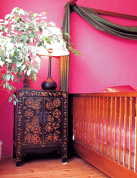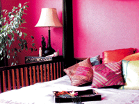 香艳泰式 一说到泰国,头脑中就闪出一个字“艳”。虽然家具是深栗色,但是泰式的装饰品多是色泽极为艳丽的。金色、翠绿的纱幔,金色珠帘、真丝靠垫、粉红的荷花蜡烛……有了这些,深色的家具反而更添香艳意味。