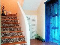 地中海 拱形与淡白的色调是地中海风格的突出形象。这个楼梯是突出地中海风格的一个亮点,做法是扶手用砖彻,再用水泥沙浆披一层,最后刷上淡黄色的 防水涂料 。踏步采用与 实木地板 一样的材料,下面装饰菱形图案的瓷砖。