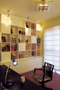 书房里的书架 书房十分简单,没有碰到设计师以前,主人已按照自己最初的设想预订了墙上的挂架和书桌,能发挥想象的地方就只是书柜了,于是就在给书柜格子安门的时候进行了一些小创意,错落的门增加了不少的意味。 未实施的设计——楼梯间灯 这个楼梯是一个使用率相当高的地方,因此这个地方的环境质量尤为重要,主人和设计师采用现代装置的手法,在这个地方设计了一个名为水滴的作品,水滴由小而大悬挂下来,这个设计会使空间富于声响效果,富于禅意。另外玻璃制作的雨滴在光线照射下有绚烂的效果。因为时间,主人一直也没完成这个设计。 |