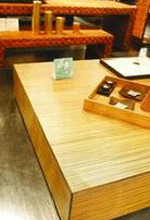 竹皮正方形矮茶几 特点:茶几表面的竹皮制作工艺十分独特,经过切片、上 底漆 、粘贴、复合、打磨、上面漆等工序,在茶几表面形成光滑平整、竹纹清晰的竹皮,有特别的视觉感受。 |