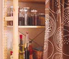 搁板+布帘:对付拥挤的厨房 使用搁板是个很好的选择,它让你的瓶瓶罐罐、各种调料能摆放整齐,而且拿取也很方便,轻轻松松就能让你的厨房看起来整齐划一,而且装卸都很方便,只要3个螺钉就可以搞定了--如果瓶子太高放不进去,只要稍微调整搁板之间的间隔就可以,这样的好处普通碗橱可不具备。