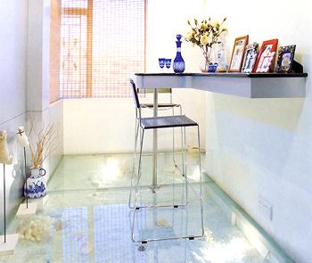 这里是用钢化玻璃抬高一级的酒吧休闲区,玻璃池里放满海沙、贝壳珊瑚及珍珠,灯光从地面打上来,影影绰绰的珊瑚投影与嵌在墙面的巨型水族缸组成了一幅绝妙的海底水晶宫图!
