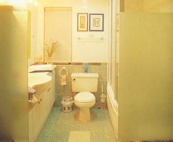 卫生间铺仿马赛克砖,水晶般质感又不滑倒人,整体色泽十分和谐。 |