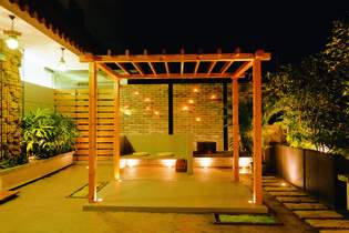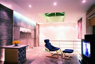 三楼是休闲区,从天窗投射进来的光线投射在室内大幅的装饰墙上,水泥板的苍劲,青砖片的韵律感,不锈钢条的冰凉,印尼白木墙的温暖皆清晰显现。墙体中间层架后镶嵌的银镜,使水泥的灰冷、粗糙形成重重的对比,戏剧效果更浓,原来一堵墙也可以有这么丰富的内涵。这个与自然可分可合空间,是屋主最爱呆的地方,因此家具饰品的选择也毫不含糊,一张舒适的躺椅、一套精美的家庭影剧院,都是会享受之人的宠物。 |