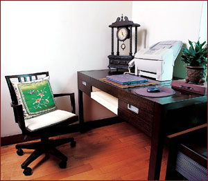 书房的色调是沉重的,古老的座钟、刺绣靠垫与桌上的传真机、笔记本电脑形成了强烈的对比。