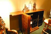 酒柜 稳藏折叠机关 特点:折叠家具无疑是一个很有创意的想法,不仅可以根据房间空间自由伸缩,还可以把物品埋伏得无影无踪。 收纳方式:比如巴厘风情的这款酒柜,在完全打开的时候,就是一处家庭酒吧,不仅可以藏纳多达50瓶红酒,还可以收入十多支高脚酒杯。 推荐家具 金箔酒吧柜:周身被刷漆金箔包围,复古造型有怀旧的味道。