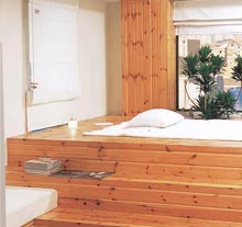 这是在独身居所的房间里可以尝试的创意。将地面增高至屋顶高度的一半左右,形成独特的结构。高出的地面和原来的地面之间,可以用阶梯相连。这样将空间分割成两部分,底部用于收纳,上部可以将其装饰成卧室,还能享受到阁楼般的温馨气氛,可谓一举两得。在阶梯的中间部位,放上一个大坐垫,就有了一个看似平平,却很柔软的休息空间了。