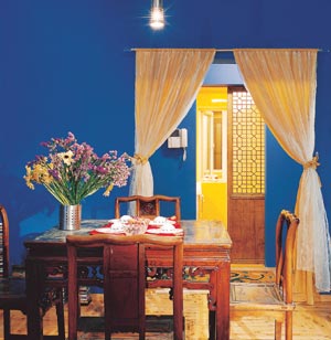 宝蓝色墙壁+明黄色布艺+浅色地面