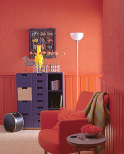 灰紫色加黄绿色是近年来比较流行的一种色彩搭配,通常是紫色做墙面,配以黄绿、宝蓝、玫红等鲜艳颜色布艺,深棕色家具。 深红色墙+红、褐色家具+浅原木色地面
