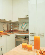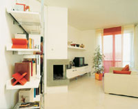 房间之内,无论何处,不同的色彩点缀在白色中间。作为对比,橙色的 窗帘 能够带来自然光所具有的那种温暖的感觉。房间内的装饰是非常现代的, 惟一带有过去岁月痕迹的便是那张具有十九世纪风格的樱桃木桌子。Cappellini Mondo的布艺 沙发 位于中间,同时墙壁上的漆光搁板和各式各样的小器皿也都是Cappellini的作品。