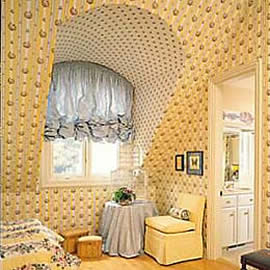 小阁楼在黄色的装饰下充满生趣,屋顶窗所用的稍有差异的墙纸增加了立体感和开阔感, 窗帘 和桌布的银灰色则是恰当的调和色。