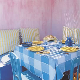 这是经常使用强烈颜色反差对比的地中海风格的一个典例。蓝方格、黄条纹与淡红背景制造出浓郁的地中海浪漫风情。 |