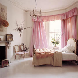 占了主卧室半幅墙的粉红色窗幔流露出款款深情蜜意,营造出好一个温柔乡。