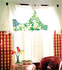 一条刺绣薄纱松松地搭在一根木制 窗帘 杆上,并在两端打褶,形成短垂摆。两扇挡光的百叶窗关闭着,让强烈的阳光变得温和、宜人。 窗帘 尺寸 尺寸选择,其长度约长于窗台20至30厘米为宜,以免被风吹起,露出窗框。若两扇窗相隔很近,就用两块 窗帘 将窗连成一个整体。选用落地 窗帘 则要高地一寸左右;其宽度可按窗口宽度乘上1.5~2的比例制成。 |