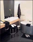 都市酷男人 黑色酷而时髦,是经典的风格。用黑色给都市男人定性是约定俗成的。所以为他们打造的浴室也自然是黑色的。从洗漱套件到地毯、熏香灯都一丝不差地选用黑色,连男士专用的香水沐浴露都是用黑色来包装的。如果觉得色彩太单一的话,可以用白色、灰色来调剂一下,就算是一枝简单的马蹄莲也可以起到特别的效果。