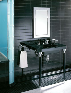 潮流轮换,黑色始终为时尚人士所钟爱。高光的长方形黑色瓷砖,配以地面的黑色马赛克,黑色的面盆,白色的毛巾,不锈钢的浴室配件,风格显得大胆而现代。 |