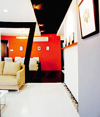 米色系布 沙发 前是一张设计简单的白色咖啡桌,跟地板的白瓷砖配合,色调一致,很有现代感! 客厅的色调让人感觉舒适、平静,走到饭厅,情绪不禁高涨,地板是黑色的云石,跟客厅的淡色系成为强烈的对比,客厅与饭厅之间是一道别出心裁、不规则四方形的黑木框。 饭厅的一道墙髹上大胆、突出的橙色,餐桌亦是黑漆漆的木配搭磨沙玻璃台面,配搭得宜,非常讲究,营造不一样的用餐气氛。