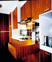 厨房延续饭厅的黑色色调,传统L型的厨房,地板是黑色瓷砖,壁橱则是褐色的,使到原本面积不大的厨房,不至于因暗色系的使用而显得更小。 由于面积不大,厨房壁橱是做到直达天花板,此外,在煮炉旁的台面部分,其中一部分还是悬空“凸出”,多出一些地方摆放东西和准备烹煮的材料。 |
