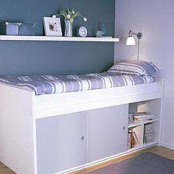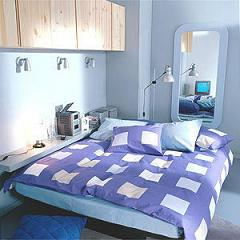在人们的印象里单身男女的房间往往和凌乱联系在一起,但是随着经济收入的增加,家具的不断简化、改良,很多单身男女的房间可以变得整洁而又温馨。当然还有一个最大的好处就是容易清洁,适合工作忙碌的“懒汉”、“懒妞”。麻雀虽小,五脏俱全,虽然很多人都用宜家的东西,有点缺乏个性,但是宜家家具的好处就是让你在高低错落都能达到井井有条。图中的吊柜充分利用了空间,灯的布置又给卧室充足的 光源 ,而镜子也起到了扩大空间的作用。床上蓝白格子的床品看着也干净,耐脏。这一居室尤其适合单身男士。 |