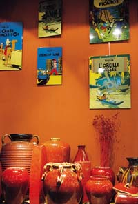 | 蓝莲花盛开的地方,一切都显得幽蓝幽蓝。从来没有见过蓝莲花,但画家埃尔热笔下的丁丁,早将它在世界各地的历险记与蓝莲花一起带到了中国,这店里就悬挂着一张大幅的《蓝莲花》漆画。