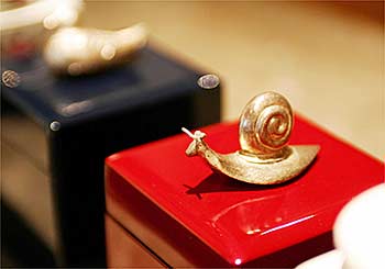 活灵活现的小蜗牛(左)和设计师设计的木盒,都是精致的小摆设。 |