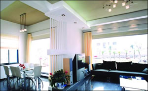 在紧张忙碌的工作之余,谁都想有个温馨舒适的港湾。这套房屋的主人张先生是在政府部门任职的公务员,为人比较低调,但对生活的品质要求很高,要设计师在尽量控制造价的同时,对整体居室效果要把握得当,既要经济,又要有相当的品位,更要“耐看”。 设计师根据张先生的个人兴趣爱好,大胆运用新型装饰元素,加上灯光效果,创造出了一个高雅、明快的洁净空间。 客厅在色调搭配上以深色和白色主调,适当地点缀个性色调。用深色的抛光砖做地面,墙面刷白色乳胶漆,顶部以直线造型吊顶,表面涂米黄色乳胶漆,层次分明,沉稳大气。客、餐厅形分神连,因为原建筑电视背景墙长度不够,设计师巧妙地设计了12米长的装饰格栅,既弥补了电视墙长度的不足,也起到了较好的装饰作用。