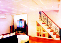 梯形的楼梯下部被设计师分割成两部分。矩形部分用做储物,充分利用使用面积。三角形部分用做酒品展示,与周围会客的功能较好地融合在一起。酒品展示阁设计成六个小区域,小三角区域顺楼梯而上,使此局部既有韵味又显得极其精制。