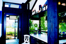 | 居家空间中总有一些空间被人们认为利用率低或是死角,但通过设计师合理的规划后,会成为居室空间的一个亮点。如图所示:为该房屋通往后庭院的出口,虽然位置不如客厅入口那么引人注意,但在设计师的设计下,同样成为视觉的亮点。黑色木制框架,宁重中又不给人以出行时的压抑;白色的台面与深色的构架遥相呼应,再配以绿色的植物,让所有未出庭院的人都有一种“未见其人,先闻其声”的感觉。