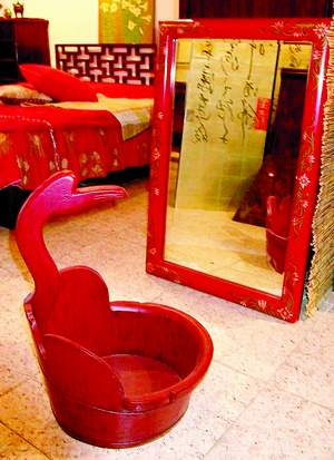 灯饰有手工纸、羊皮纸,也有红色纱绸 布料 ,各种质地不同的灯,为家中不同的空间设计了不同风格。灯下的那一方空间,常因为零星的一点“灯红”而散发出意想不到的温暖。选一款独一无二的手工制灯,当做给家的新年礼物吧! 搜索地:朝阳区高碑店古家具村大元空间 窗纱 轻纱及地欲拒还迎 红色和浪漫有关的话,和轻纱也必定有关。轻纱是一种很女性的东西,苗条修长,随风起舞,婀娜多姿。红色的轻纱既柔媚又娇气,无论在客厅在睡房都那么朦胧柔美,让人禁不住想多看几眼,一探其中温暖又含蓄的秘密。 及地或即将及地的红色轻纱最为浪漫。不需要太宽,过宽则少了一分欲拒还迎的矜持感。 搜索地:朝阳区高碑店古家具村鲁班馆 彩绘茶车 浪漫与实用兼顾 最初被红色茶车吸引是因为它的颜色以及精致的手绘花,摆在客厅的每一个地方都会有一丝说不清的“古典”。然而走近一看才发现这个“大箱子”其实可以四开八合,打开以后就成了一个可以倒水泡茶的小小茶艺坊,里面不同的格子可以摆放不同的茶具餐具。 茶车合上后,还可以当做一个小饭台,浪漫之余还很实用。 搜索地:朝阳区高碑店古家具村鲁班馆 “鹅盆” 优雅不失俏皮可爱
