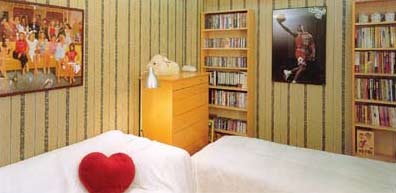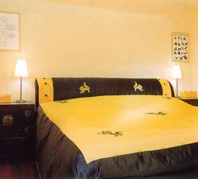 主卧室的的风格可谓现代与传统的结合。宽大的软床上铺着明黄色织锦龙形图案的床罩,与纸巾盒、杯垫呼应对照。再配上两个铜活儿箱柜权充床头柜既别致又舒适。床对面高大的衣柜却是极现代的式样和材质,是铁皮与有机玻璃的结合。衣柜前有个装衣服的小筐,虽然被安置在角落里但银色金属在阳光下闪闪发光充满时尚的感觉。 最后征得了主人的同意,我们推开了他们的儿子英巴颜的房间。首先映入眼帘的是一个鲜艳的滑梯床,做成了帐篷和古堡的样子。梁欢说这是英达坚持要给儿子买的。因为他自己小时侯就盼望睡在这样的帐篷里,可惜没实现。所以他希望给儿子一个没有遗憾的童年。有趣的是,我们发现儿童房里的大部分玩具都是Wonnie the pooh,甚至包括英达为儿子亲笔画的水盆,水盆上Rudi(巴颜的英文名字)与小熊维尼和它的伙伴们在嬉戏。梁欢说这是英达的另一个情节:小的时候妈妈老给他讲Pooh的故事,所以他也总是给儿子讲Pooh,没想到若干年过去了,Pooh再次成了迪斯尼的大明星。