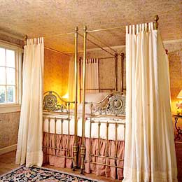 全方位的壁纸营造了一屋华贵温馨,铜支架二合一大床,更让人心动的是白床帘的浪漫情调。 |