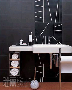 浴室黑白配 十足酷感 空间风格 这间卫浴的色调以黑白灰为主。墙面灰色的亚光瓷砖中间,因为贴了一道西德石雕花 墙砖 ,使单调的墙变得丰富起来,在整体视觉上让人感觉很舒服。 收纳方式 象牙白色陶瓷面盆,兼具洗面、置物两种功能,白色的洗手液瓶和黑色的牙缸显得很搭调,旁边收纳盘里的东西也不显凌乱。不锈钢架子具备了搭晾毛巾和搁置卫生纸的多种功能。置于地面上的清洁刷子也被安静地收纳在一只象牙白色的陶瓷器皿内。 材料选择 面盆是陶瓷的,台面下的柜子是不锈钢和实木做的,整齐地搁置着白色的毛巾。卫生纸也平稳地搭在不锈钢的架子上,随手可得。墙面贴的是亚光瓷砖。浴室的地面,采用的是棕色的实木防水地板。 特别提醒 由于色调比较暗,这间浴室适合光线充足的房间。收纳物品时应选择与之同色调或跳眼的红色。 |