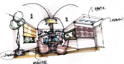 因为该设计中的业主是一个游戏玩家,平时在家玩电脑的时间多一些,他比较崇尚现代、卡通感觉的一些设计元素,同时,他希望在书房里能和朋友们一起联网。所以,我在做设计的同时,也以卡通、现代元素为主,采用了太空色(银灰色)为基调,家具是特别设计的岛型游戏台和可调节式的 沙发 ,电脑视屏采用可调节式处理,中间用内发光的琉璃产品为支架,同时,也可以放大量的游戏光盘。在穹形顶下,四围墙体的弧面处理,可能会更显得圆润一些,加上内嵌式少量书架(碟架),使整个书房游戏味道十足,充分体现了主人的爱好和个性。 走进电脑玩家的书房