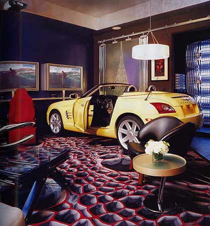 车库:设计师用两辆克莱斯勒300C的后座制作了 沙发 ,这灵感无疑是从美国南方人家的门廊获取的。亮点:吧台表面是被打碎了的汽车挡风玻璃。等离子电视6台