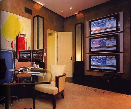 书房:风格,时髦中显现精致。事故男人在此德三条线索,6个展示世界各国首都的玻璃墙柱,价值75万美元的Hans Hofmann绘画、3台索尼等离子电视、分别用英语、日语和西班牙语播音。