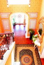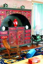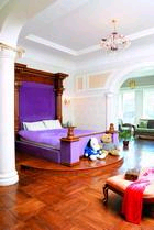 古典风格也可以舒服 “我是矛盾的一代,小时候被爷爷奶奶带大,接受的是最传统的教育;少年时在北京外国语学校附小,接受了西洋教育。大学毕业去日本待了7年,接受了作为社会人的初期教育,然后又回到了古典又现代的北京。”这是女主人对自己经历的简短概括。虽然只有只言片语,但是已经足以说明她的家居风格的全部由来。家里纯白色 大理石 质地的各种柱头是欧式元素,而茶几一律是扬州漆器,刻漆雕花,以花鸟雕花、吉祥图案为主。大部分坐椅是“洛可可”风格,手工雕花,局部贴金箔,以曲线雕花为主。最独特的是那座壁炉,主人特意在上面添加了中国传统的雕花技术,无论是色彩或者造型,都结合得天衣无缝,风格已经不能用确切的国家来界定了。还有那些璀璨的水晶 吊灯 ,无论与金黄的壁纸还是木梁,都能一一呼应。客厅没有放电视,为的是朋友来了,可以在美丽的音乐背景里聊天,不被电视干扰,再说人家也不是来看电视的。喜欢自称是农民的朋友,干脆就坐在地毯上。 宽敞而高大的客厅中有女主人喜欢的明亮大玻璃窗,长长的红色窗帷静静垂落。中西图案结合的壁炉边, 沙发 和靠椅精致的 线条 、细密 的花纹雕镂着宫廷式的典丽与华贵。而在客厅的另一头,中间的罗汉床很柔和地在不知不觉间完成了从欧式到中式的过渡,目光尽处,是女主人最为心仪的漆画《清明上河图》,梨花长案上宝相庄严的佛像,华美的古典风格从此又多了一种安宁与淡定的韵味。 主卧简单却又洋派,淡紫色的大床给睡眠增加了许多静谧与温情。 漆器的茶几与描金的家具相配,是富贵的大家风范。