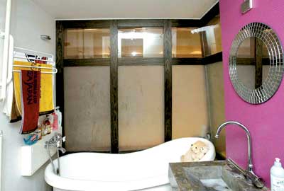 阳台客串浪漫书房 彩色珠子温馨阳台 进入陈妃平的家,立马我就喜欢上了阳台,虽然在夜色下,一切显得十分安逸,但是,我猜想,要是白天能够躺在这里一边享受着阳光的沐浴,一边喝着咖啡、看自己喜爱的书,该是件多么美妙的事情。阳台上挂着粉色与黑色的蕾丝花边 窗帘 ,这可是陈妃平亲手设计的,根据季节或心情的不同换不同颜色的 窗帘 。区分阳台与客厅的是几串彩色的珠子。 左上角是一个佛龛,一尊剔透的菩萨眯眯笑,一小炷藏香闲闲的缭绕……我问她:“你信佛吗?”她说:“很自然的,我觉得佛能使人恬淡。” 家中处处是玻璃 客厅连通过道的那面墙被拆除,改建为两面不规则的玻璃墙,并以粗重的 木材 镶嵌出结构。在陈妃平家中,几乎都离不开玻璃。因为房中的承重墙非常少,屋主可以拆除墙面进行空间改变,所以陈妃平专门为厨房和卫生间设计了玻璃墙。“玻璃给人的感觉很通透,会像变魔术一样把空间变大,而木头厚重敦实,两者在一起形成了很强的立体感。”陈妃平说,正因为玻璃上有了 木材 的镶嵌,使得整体感觉不那么的空洞,看起来很充实、很温暖。
