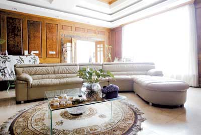 | 在马羚家的门口,一对忠厚的汉白玉象好像忠实的门卫,矗立在大门前。一走进大门,眼前就是精心设计布置的庭院山水,真的是小桥流水人家啊,一派田园风光,令人心旷神怡。我感觉自己像是刘姥姥,仿佛走进了大观园。我想面对“大观园”,肯定会有成就感,但提起装修,马羚却有满肚子的委屈:“房子装修大约花了4个月的时间,不说天天得在这里盯着、挨宰,最后工程质量还不合格。”