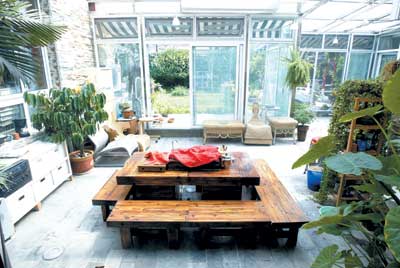 坐在客厅聊聊天 室内建花园不只为浪漫 童话故事中有这样一个玻璃房子,藏在绿树红花中,每天每时每刻都和蓝天白云做伴,一年四季无论春雨夏阳秋露冬雪,都可以安稳地欣赏景色。露台四面都是玻璃,夏天炎热时,顶上还会有流水倾斜下来。抬头而望,一个榕树的旁枝刚好遮盖着屋顶。玻璃房子就像一个温室,里面鲜花绽放。马羚家的玻璃房就是这个样子的。 玻璃房里有一张实木的大桌子,上面整整齐齐地摆放着茶具,阳光灿烂的午后,玻璃房宁静清闲。当夜晚来临时,玻璃房在灯光照耀下,成为主人邀请客人的场所。