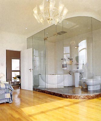 用玻璃隔出卫浴间,使一个房间同时具备了两个房间的功能