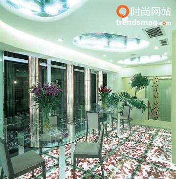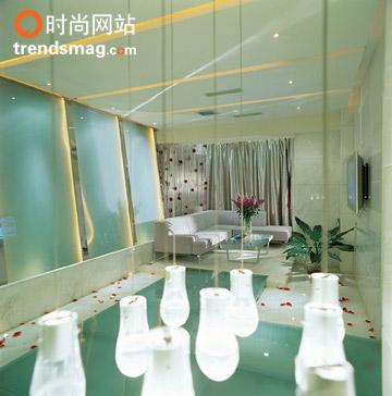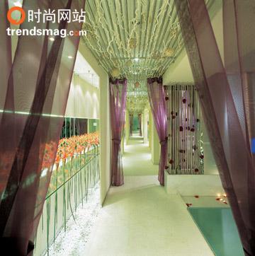 适度的灯光投射过来,不由地怦然心动,仿佛有一股暗香在空气中缓缓流动。 设计空间也是设计情趣 女人如花,千姿百态的柔美花朵最能代表女人。热情奔放的鹤望兰、清新雅致的紫玫瑰,布满空间的每一个角落。每个美容间都有一个色调,配以相同色系的壁纸、纱幔,还有墙上精心雕琢出的玻璃花带,里面“种”着的艳丽花朵,与整个空间的色彩相互辉映。而玻璃隔墙中的构造更有情趣:两片透明玻璃的中间,夹着一些旋转成圈的白色麻团,间杂着缤纷的干花或一些无序的叶子,透过发散的灯光,它们有序的纹理和杂样的情趣,生出一种梦幻般朦胧又神秘优雅的女人姿态。而连接各个功能空间的长长走廊里,左右都布满了娇艳的鹤望兰,一路走过去,像一队青春活力的芭蕾舞少女,身姿婀娜,在静中又包含了动的存在。临着楼梯的休息空间里,整块的玻璃地面下洒满了紫色玫瑰花瓣和晶莹的白石子,与屋顶上方凹陷的三块椭圆形灯槽中大朵的花形图案遥相呼应。适度的灯光投射过来,不由地怦然心动,仿佛有一股暗香在空气中缓缓流动。 女人似水,晶莹剔透的变化流动最能代表女人。设计师在整个空间里安排了一个水的循环系统:接待厅、休息室、长廊边以及瑜珈馆的四周,全部设置了连通的水池,就连接待台上,也设计了一个窄长的鱼缸,池里养着几尾金鱼,漂着玫瑰花瓣;楼梯平台上的瀑布,从一排钢管间缓缓跌落,大厅的斜面玻璃幕墙,也是水流的舞台。长廊的吊顶上,用藤条塑成水波流动的形状,一路蜿蜒过去,动感而妩媚。这些流动的元素不仅将空间连通起来,而且使人可以进入一种放松的状态。