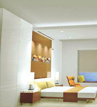 2、照明设计: 卧室是休息的地方,除了提供易于安眼的柔和的 光源 之外,更重要的,是要以灯光的布置来缓解白天紧张的生活压力,卧室的照明应以柔和为主。卧室的照明可分为照亮整个室内的天花板灯、床灯以及低的夜灯,天花板灯应安装在光线不刺眼的位置;床灯可使室内的光线变得柔和,充满浪漫的气氛;夜灯投出的阴影可使室内看起来更宽敞。 3、色彩设计: 卧室的色彩应避免选择刺激性较强的颜色,一般选择暖和的、平稳的中间色,如乳白色、粉红色、米黄色等。 4、摆设布局: (1)养精蓄锐,有一张温馨的床至关重要,人的一生有1/3时间在床上度过,睡眠需要及舒适度已被看作重要之事,因而床铺的摆设直接影响到人的睡眠状况,建议床铺摆在靠墙角的地方,床头靠向墙壁的一侧; (2)家具与床铺至少要间隔70cm,以便走动,室内的家具陈设应尽可能简洁实用。 |
