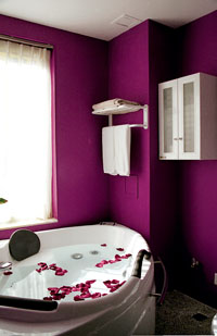 色彩对比强烈的卫浴间的卫浴间 参赛单位:元州装饰北居然设计分部 这原本只是卧室中靠窗的一角,设计师王吉力把它改造成了一个开放式的卫生间,既不阻隔阳光,也为主人提供了一个享受日光浴的好地方。强烈的色彩对比赋予了它新鲜的活力,紫色的墙壁以简单的造型丰富了空间的层次感,在白色纱帘的掩映之下,仿佛可以看见温和的阳光在流淌。纯白色的各种器具精致而优雅,窗前浴缸中散落的玫瑰花瓣正幽幽的传达着一种浪漫气息。 参赛作品3: