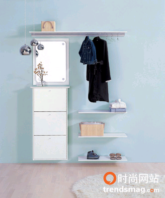 鞋柜,是玄关中最主要的角色。“进门脱鞋”,已经成为当今城市生活的一种良好习惯。在进入私有而熟悉的地方时,为了减轻束缚,人们会迫不及待地把鞋脱下;作为访客,为避免把鞋子上的灰尘带进屋内,也会礼貌地将它脱掉。另外,从美感方面来看,鞋柜可以将杂乱的鞋子有次序地排列,化零乱为整齐。 淡绿色的墙壁上镶嵌着白色的挂衣架、鞋柜、搁板和镜子,与浅色的 实木地板 组合,一股素雅清新的感觉扑面而来。 开放型